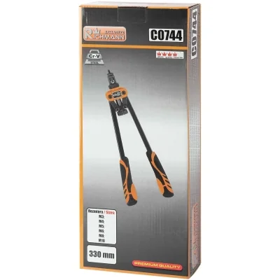 Alicate Rebitar manual projetada para porcas de rebite de aço, alumínio e aço inoxidável, acondicionada em estojo de transporte.