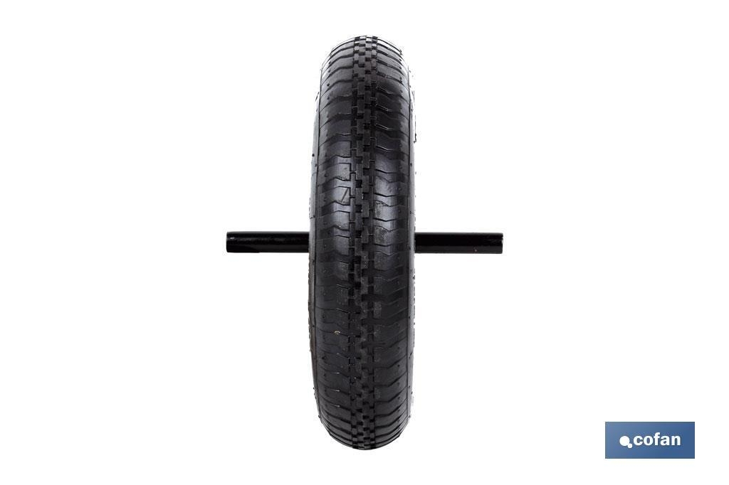 Roda "pneumática" para carrinho de mão de estaleiro com hastes Ø 20 mr. Roda pneumática para carrinho de mão de estaleiro e jardim com jante metálica ideal para uso profissional e doméstico.