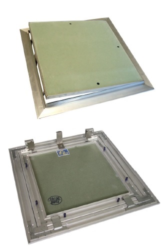 Características: de alumínio com sistema de abertura de push-pull (abertura invisível). Sistema de proteção Queda porta. Porta removível com gesso repelente de água para ser montado 12,5 milímetros.