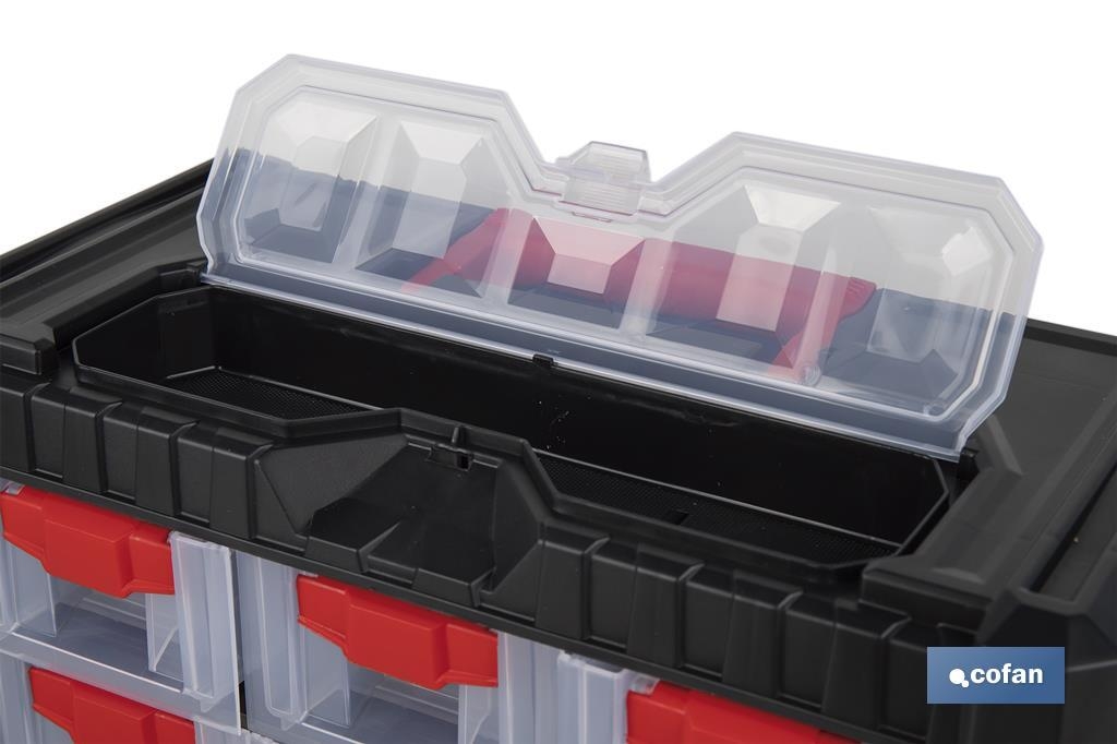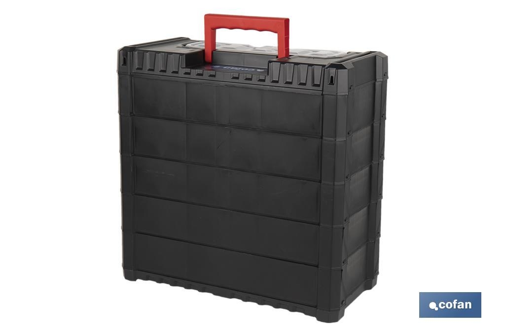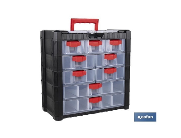 A caixa está equipada com 9 compartimentos pequenos e um organizador na tampa. Possui fechos para evitar que as gavetas caiam, alça ergonómica para facilitar o transporte e um orifício para o kit de montagem na parede.