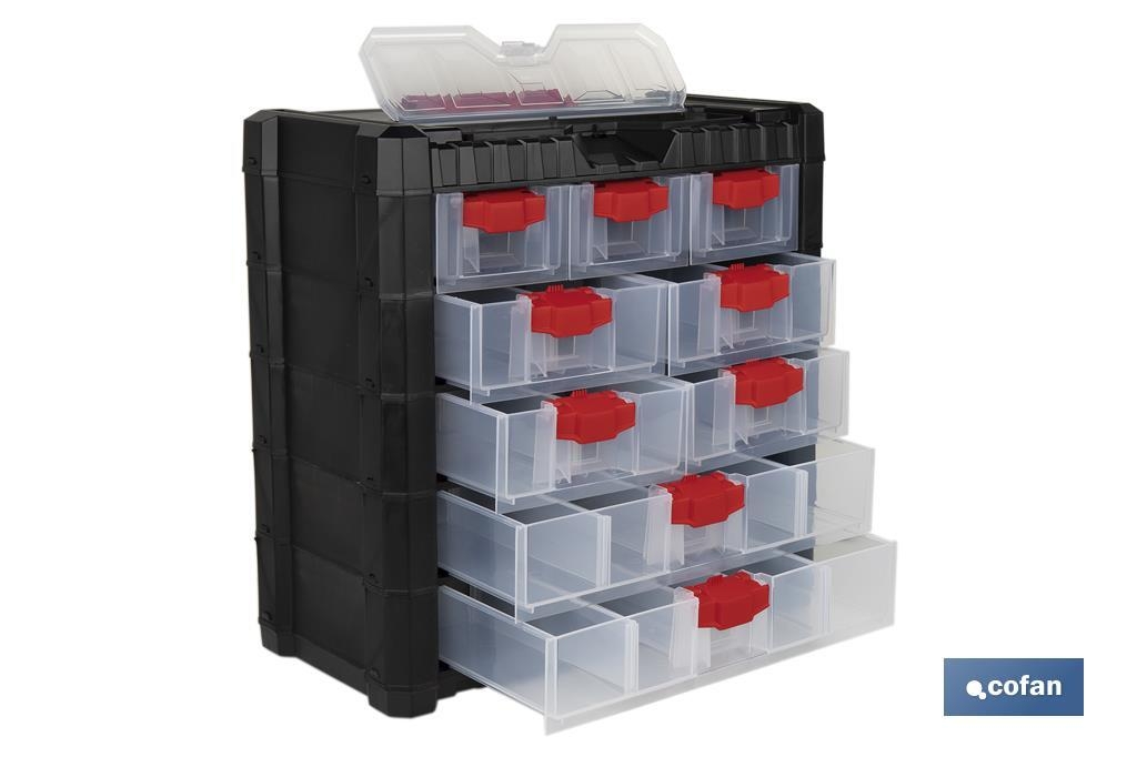 Organizador de ferramentas para a arrumação de ferramentas e peças pequenas, muito útil numa oficina, armazém ou laboratório.