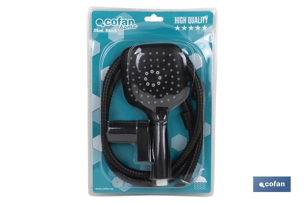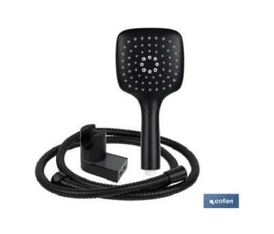 A bicha extensível em aço inox preto com acabamento fosco possui um comprimento mínimo de 1,5 mt e máximo de 1,6 mt. Também é adequado para uma banheira. O chuveiro é fabricado de ABS. Os jatos de silicone do chuveiro removem o calcário e as impurezas rapidamente e sem a necessidade de esfregar. O chuveiro de mão tem três funções: cascata, chuva e massagem.