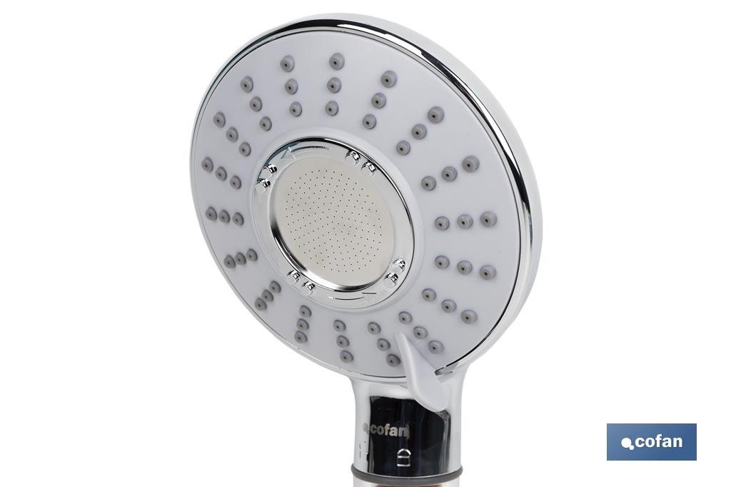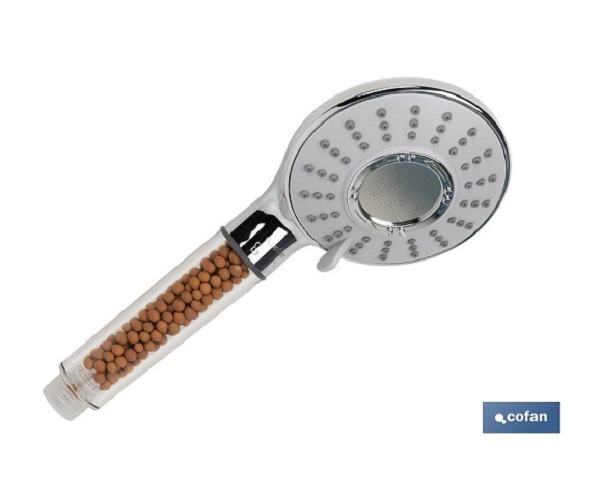 Chuveiro iónico com esferas minerais que emitem iões negativos que purificam a água, regulam o pH.