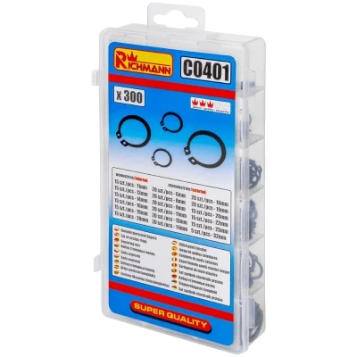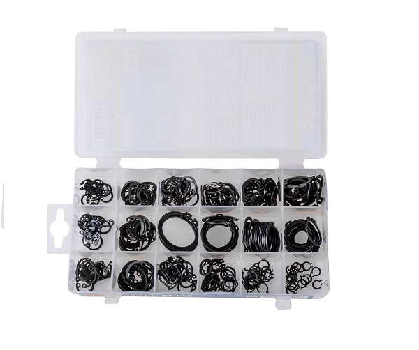 Feitos de aço mola, o conjunto contém todos os tamanhos mais comuns de anéis de retenção usados em oficinas.