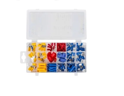 O conjunto inclui, entre outros, conectores isolados, conectores fêmea, conectores macho, ilhós, conectores cilíndricos, garfos e conectores.