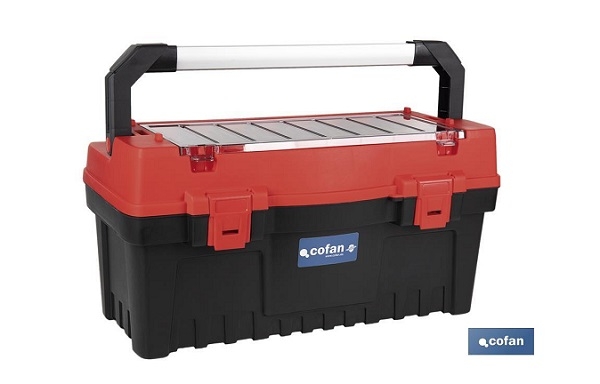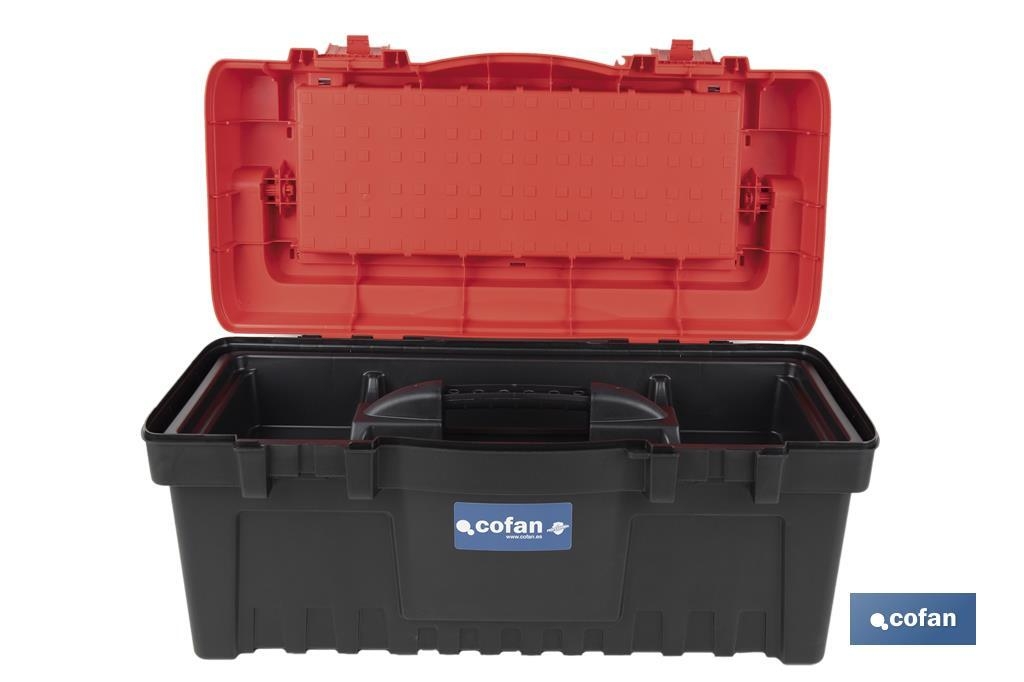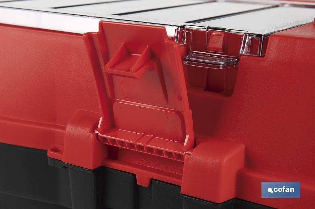 Caixa de ferramentas com fechos ABS, reforços e organizadores, perfeita para guardar pequenas peças e acessórios, ideal para utilização profissional e bricolagem. Possui compartimentos exteriores, ambos divididos em várias secções, e dois níveis interiores para simplificar a classificação dos artigos.