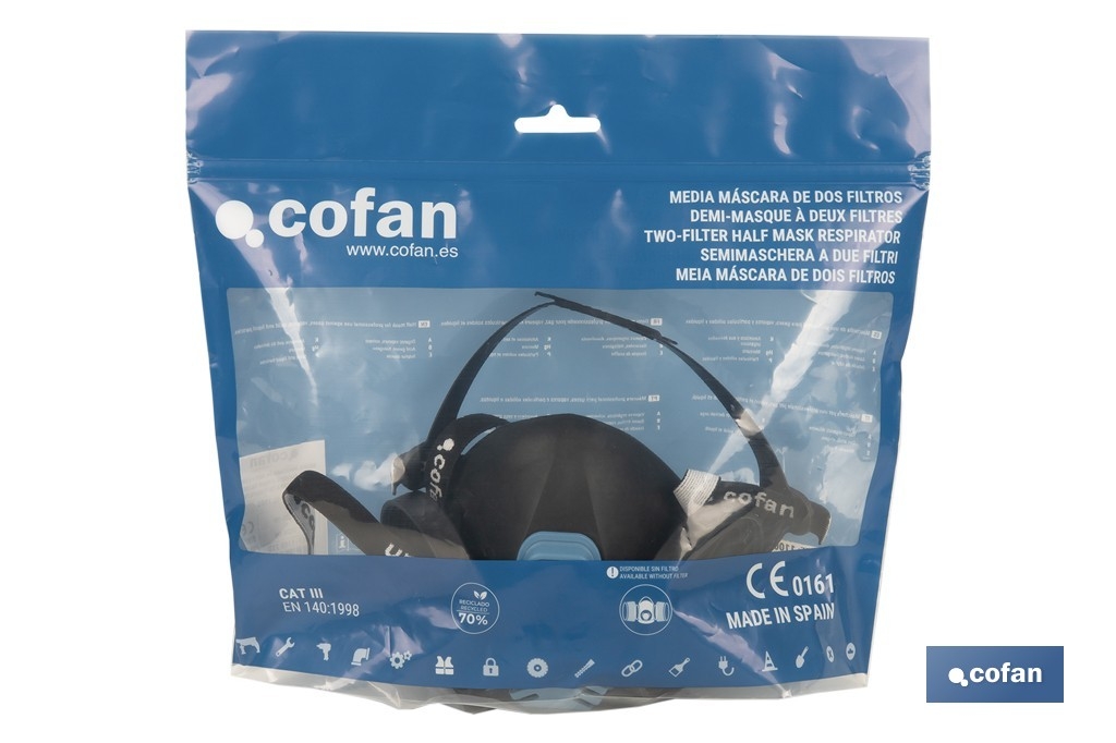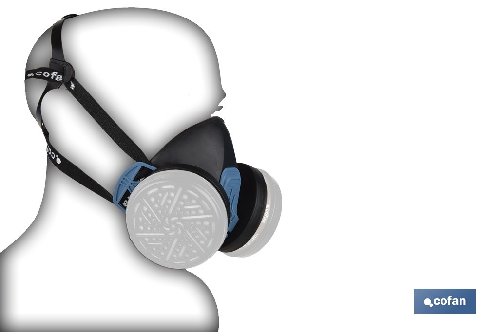 Esta máscara é compatível com filtros Cofan (referências 1002135 e 11002136) que são adequados para a protecção de gases, vapores, partículas ou combinações perigosas para a respiração.